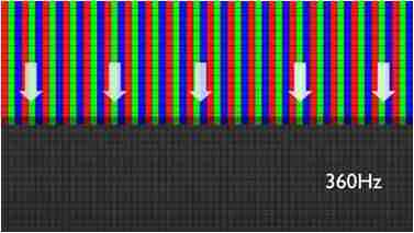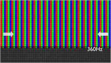 传统液晶驱动是从左到右单向进行,,,,在画面更新速度愈来越愈快的情况下,,位于驱动线路末端的右下角区域,,,画素的闸极来不及在短时间内获得足够电压,,,,无法显示出正确的颜色资讯。。 |