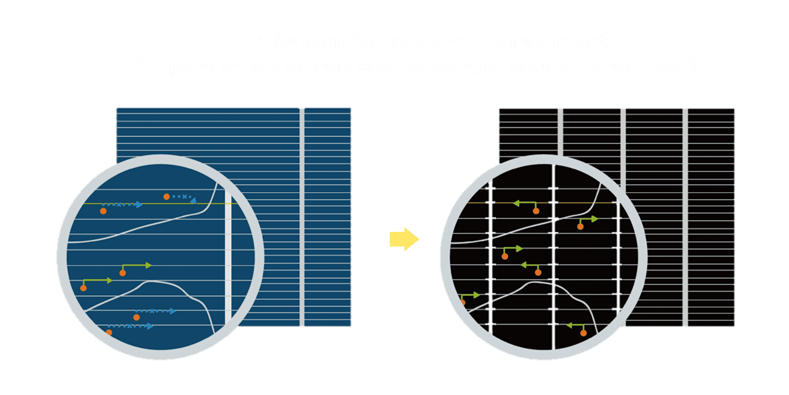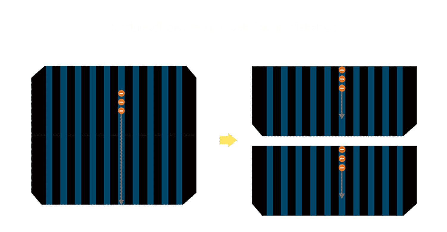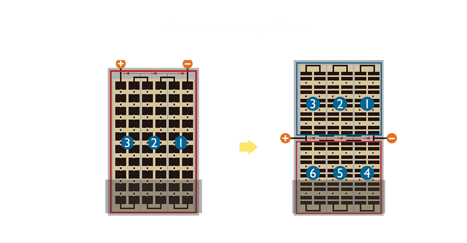 - 结合半切电池,,,降低遮阴影响、、、、提升模组抗隐裂能力、、、并减少电阻损耗,,进一步提升模组发电效能。。。。