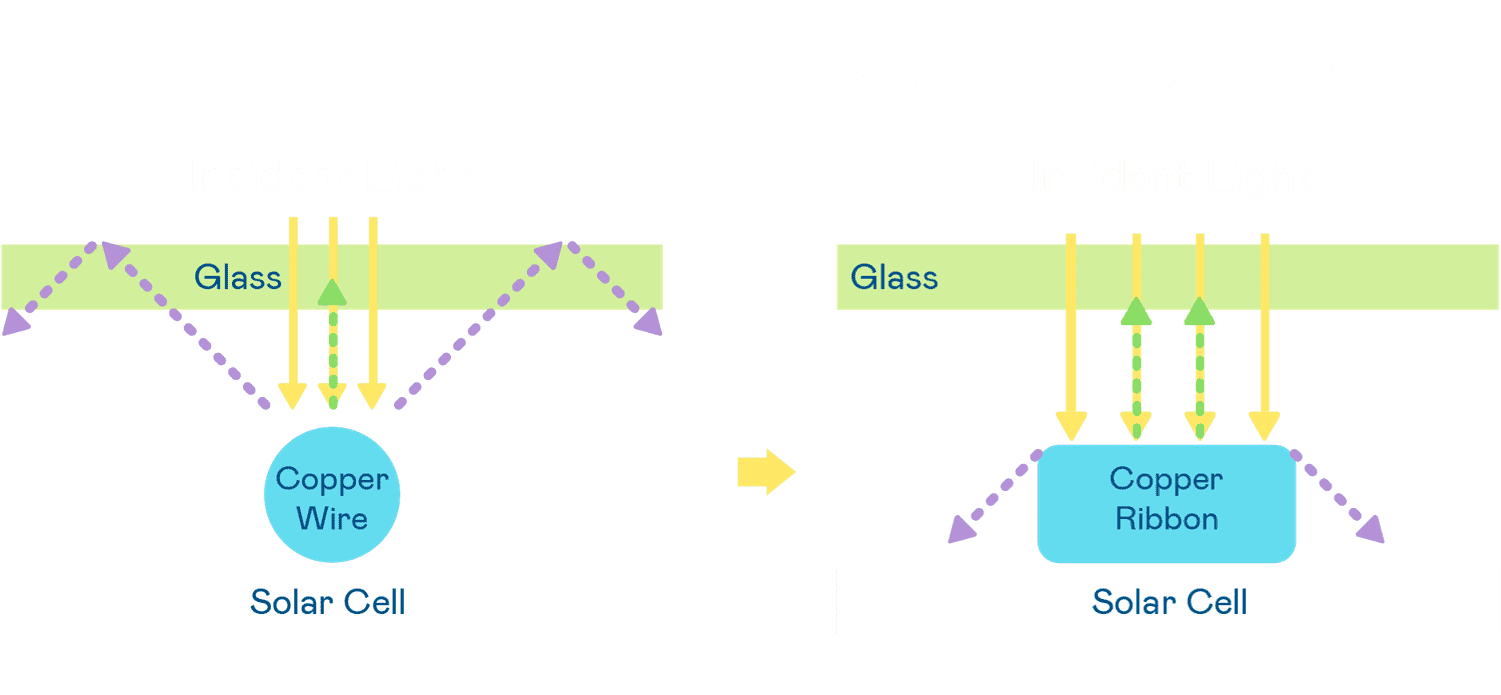 - 电池使用多条铜导线 (Copper wire) 于电池片上形成较短的电流路径,,,,提高电流收集效率,,,,采用圆形设计的铜导线较传统扁平式的铜焊带 (Ribbon),,可增加入射至电池的光线量。。。。