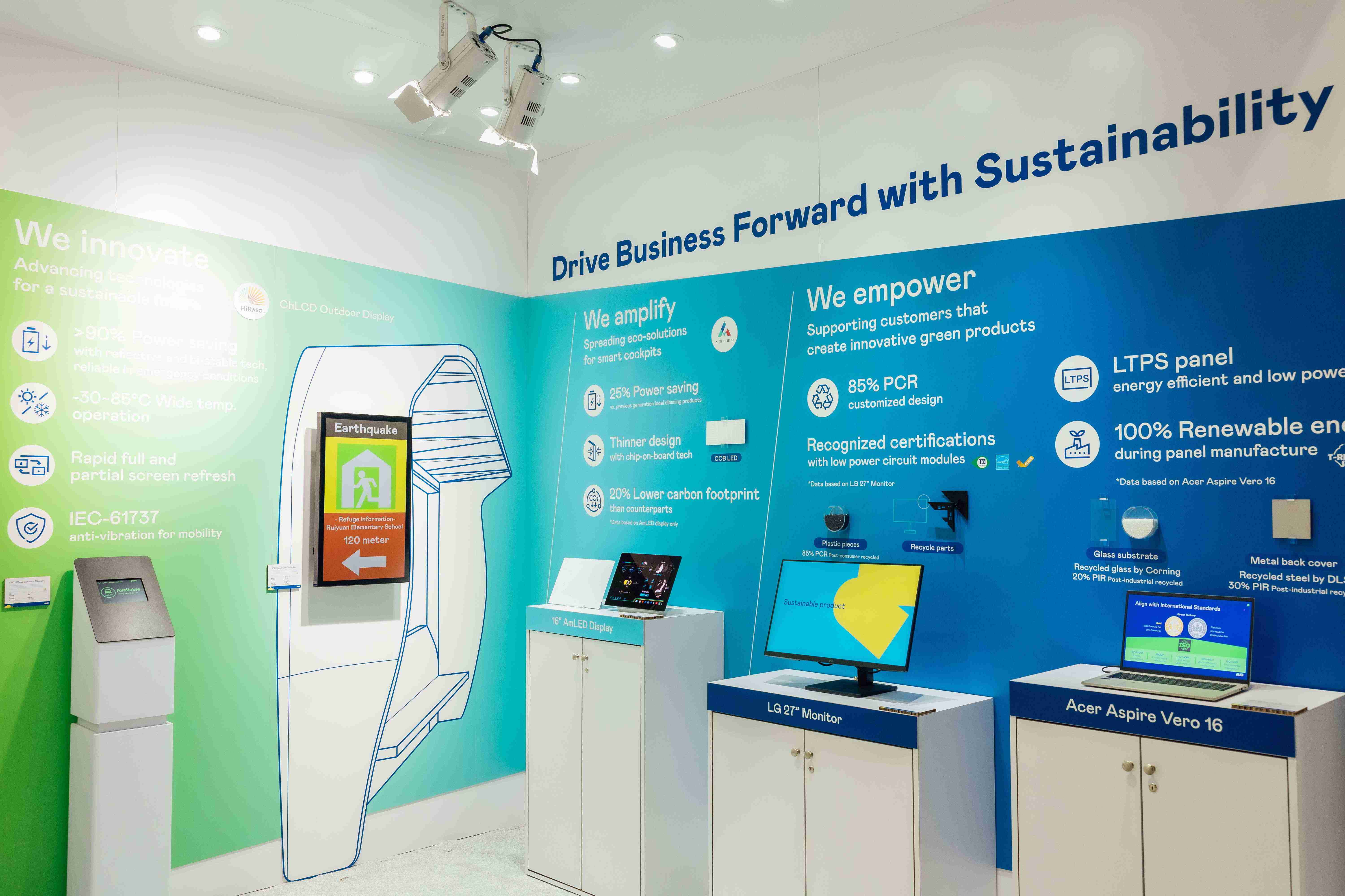 尊龙集团运用创新显示技术HiRaso胆固醇液晶双稳态技术达到显示零耗能、、、扩大节能省电的AmLED显示技术应用于车用产品、、、、以再生的消费后回收(PCR)塑料及全绿电生产之面板,,应用于笔电及萤幕,,增加绿色价值。。