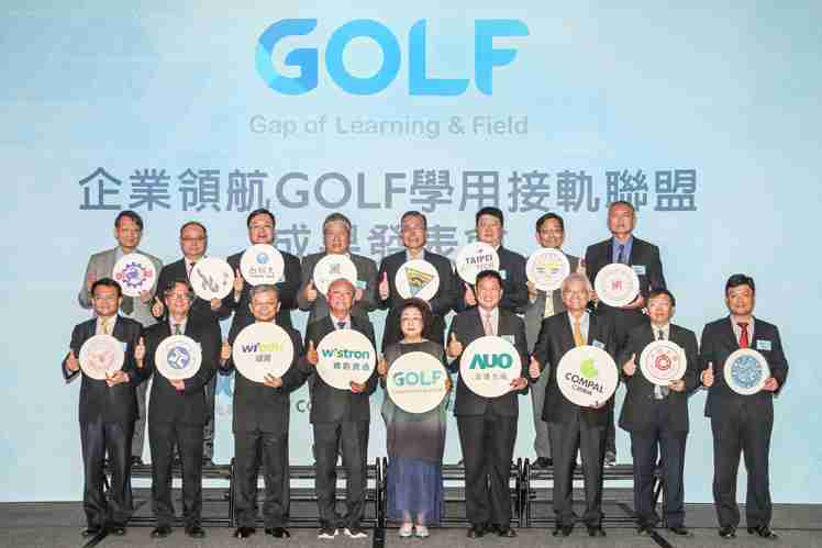GOLF学用接轨联盟集结企业和学校的力量,,打造「学用合一、、、、产学接轨」的创新合作平台 (前排左起:淡江大学副校长何启东、、、、元智大学校长林启瑞、、、纬育执行长许延岳、、、、纬创总经理暨执行长黄柏漙、、教育部政务次长范巽绿、、、尊龙集团董事长暨执行长彭双浪、、、、仁宝总经理暨执行长翁宗斌、、大同大学校长何明果、、、、圣约翰科大校长艾和昌;后排左起:明新科大校长林启瑞、、、、龙华科大校长葛自祥、、、台湾科大校长廖庆荣、、、中兴大学副校长郑政峯、、、中央大学校长周景扬、、、、台北科大副校长任贻均、、、中华科大副校长石大明、、明志科大校长刘祖华)