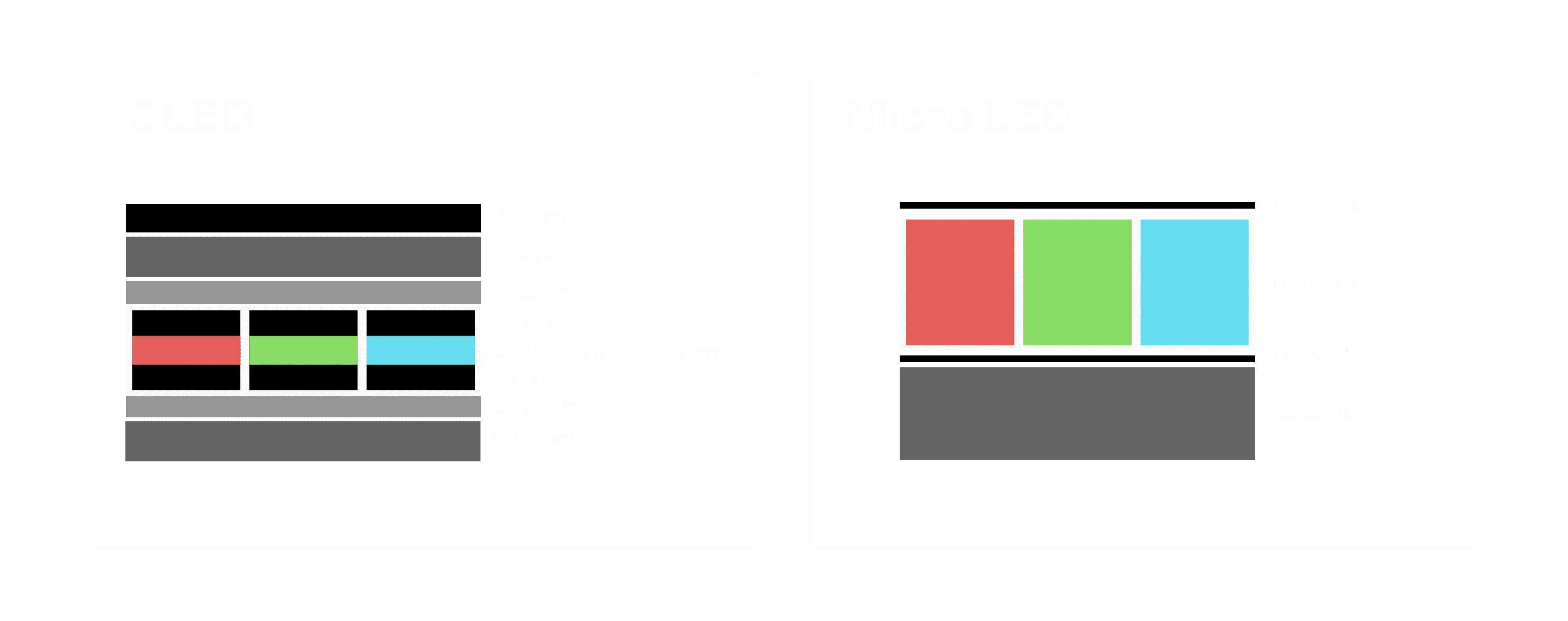 以 LED 做为显示画素,,可让 LED 的发光效率发挥到极致,,从而让显示器具备优异的亮度表现,,不论是在户外或室内,,,,均具备出众的显示效果。。同时,,与使用有机材料的 OLED 相比,,LED 具备更稳定、、寿命更长的特性,,不仅不会有画面烙印问题,,而且更不容易出现故障、、坏点。。。