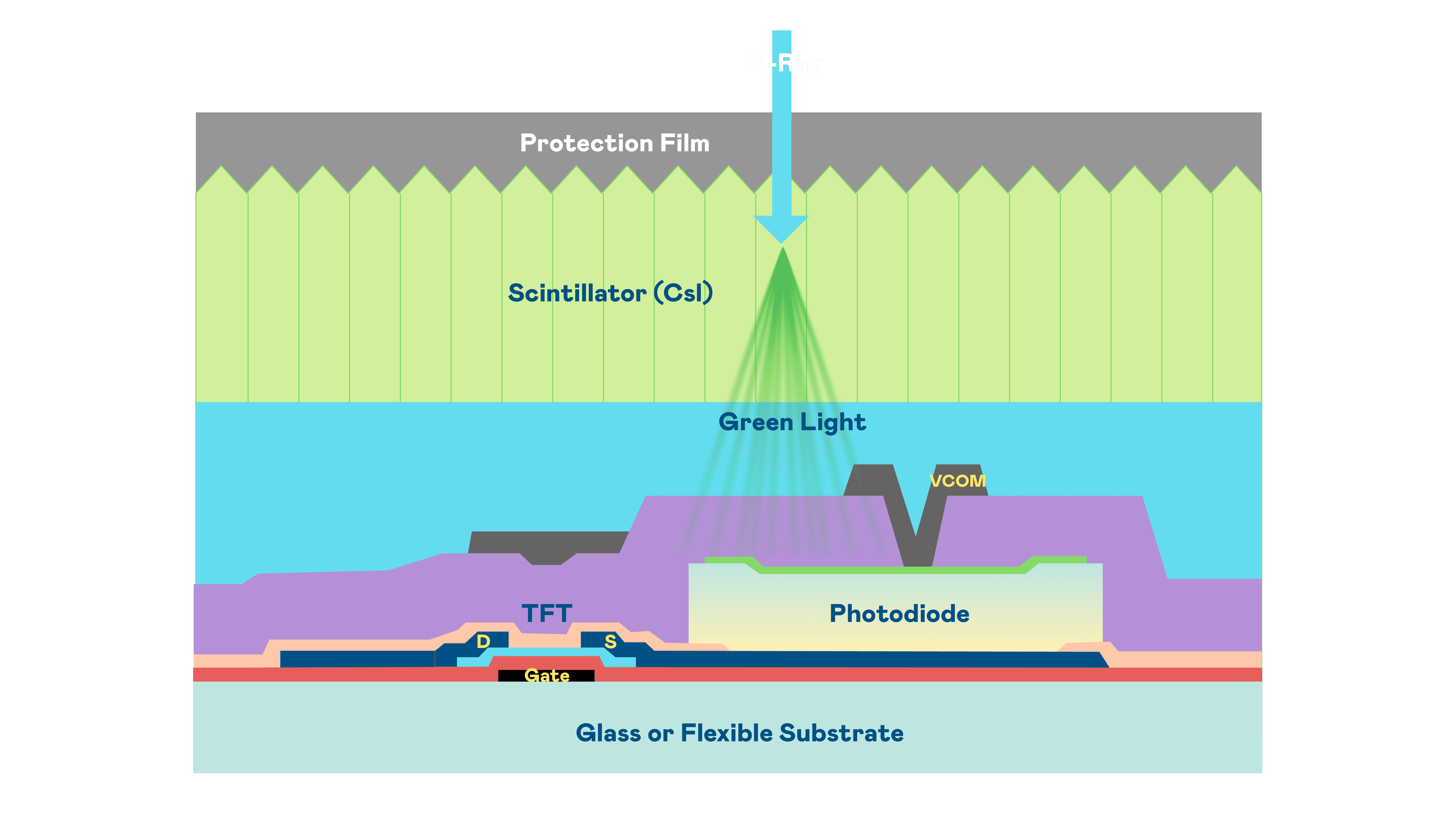 尊龙集团的X光影像感测阵列使用薄膜电晶体 (TFT) 作为每个像素的读取开关,,,搭配光电二极体(Photodiode)的光电转换元件,,,,用以感测X光影像讯号。。