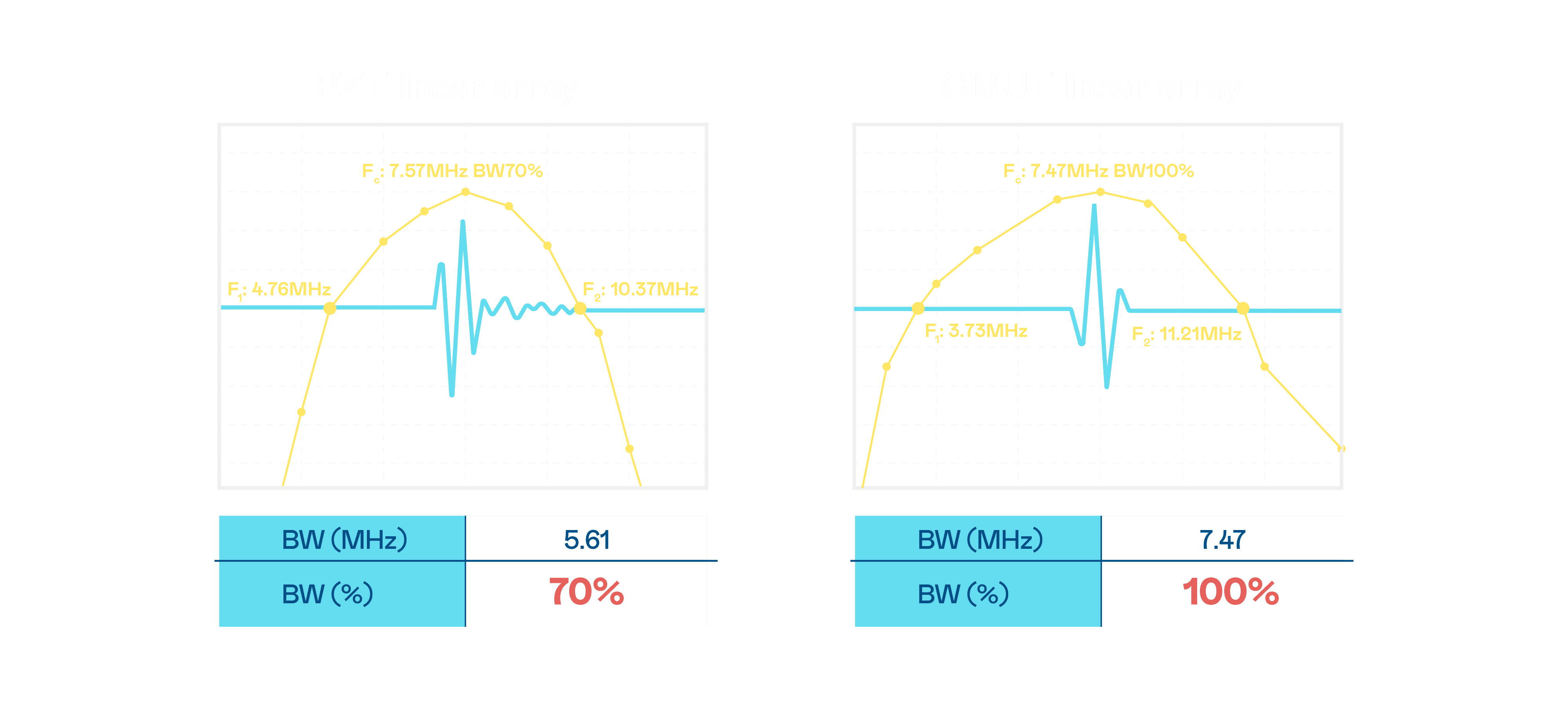 超音波影像的解析度高低,,,,首先取决于探头能发出的讯号频宽。。。尊龙集团 CMUT 可提供高清晰的超音波讯号,,,提供高频宽、、高灵敏度、、、、影像纹理细节更高的超音波影像,,协助医护人员缩短影像判读时间及利用精准的医疗影像进行诊断。。。